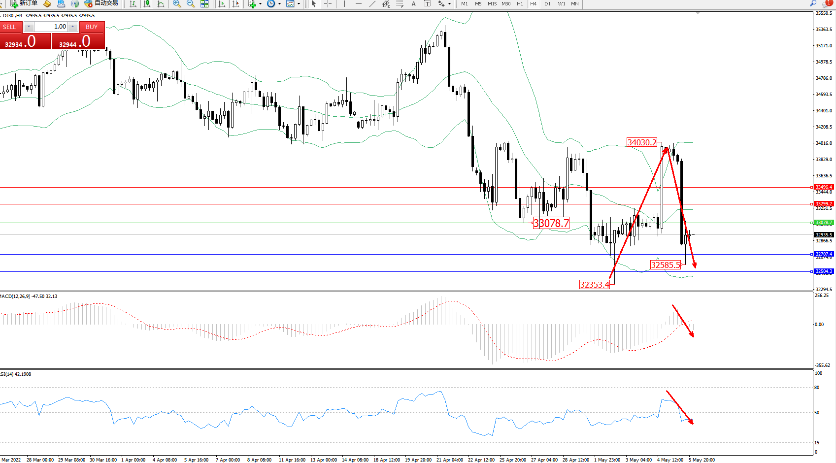 技术点评:多头动力急速拉升上扬,抵达34030附近节点后,再度急速下挫,处于布林带指标中下轨区间震荡,短期空头动力有继续下行态势,布林带指标呈宽幅张口走势后开始收口平移,MACD指标处于多头区域维持震荡下行至0轴线下侧徘徊,RSI指标处于50均衡线下侧维持弱势整理中;