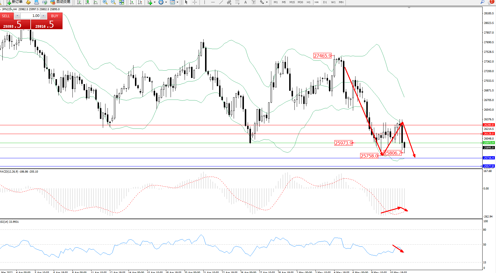 技术点评:空头动力延续布林带指标通道下轨附近持续震荡下行,低位抵达25758附近节点后开始维持宽幅震荡,短期或处于低位宽幅震荡走势中,布林带指标呈张口走势后开始缓慢收口不断下移,MACD指标处于空头区域维持震荡上移后开始下行,RSI指标处于空头区域低位维持震荡上移后反转向下移动;