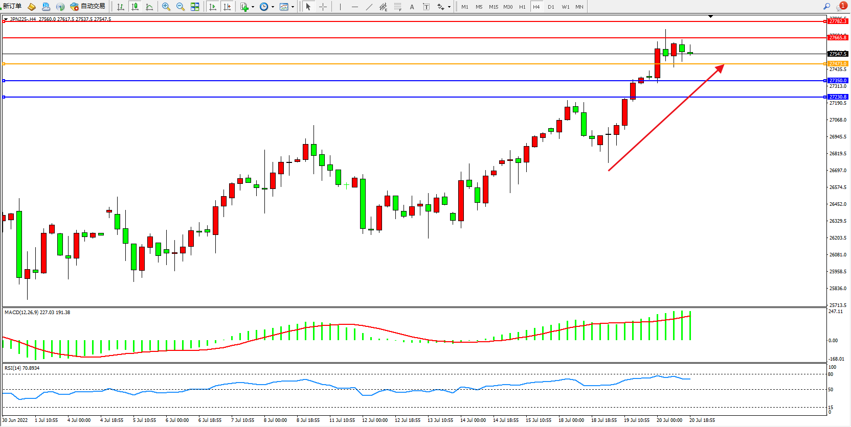 日经225指数7月20日(周三)收盘上涨710.82点,涨幅2.64%,报27672.50点。日本政府19日在自民党的经济安保相关会议上出示“特定重要技术”指针草案。重要技术是根据5月通过的《经济安全保障推进法》,将重点培养的技术。日本将从人工智能、生物等近20个领域甄选重要技术推进经济安保。