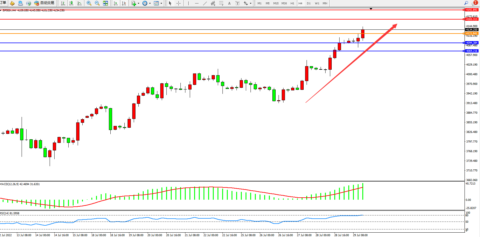 标普500指数7月29日(周五)收盘上涨58.62点,涨幅1.44%,报4131.05点;美国第二季度实际GDP年化季率初值为-0.9%,在其他经济学家预计GDP会增长的时候,亚特兰大联储的预计为-1.2%,比公布值低了0.3个百分点。下一次预测将于8月1日公布。