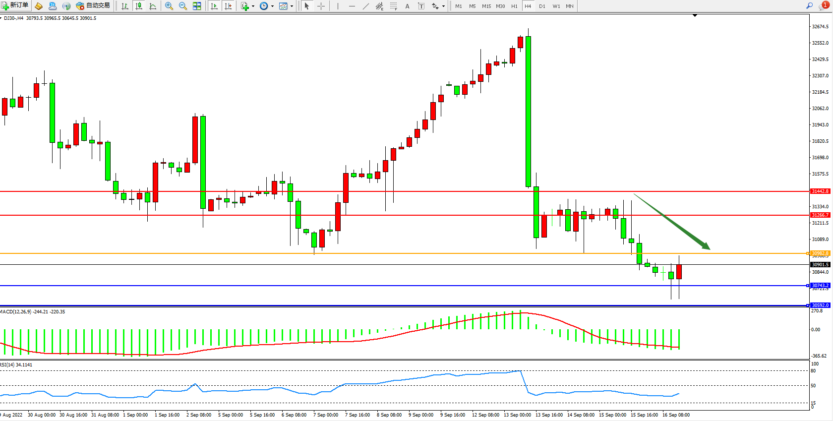 道琼斯指数9月16日(周五)收盘下跌140.32点,跌幅0.45%,报30821.50点;美联储需要加息到超过或接近通胀增速,才能明显控制通胀压力。虽然美国经济衰退预期仍在,但美国经济“弱而不崩”局面持续,美元的重要支撑力量仍在。