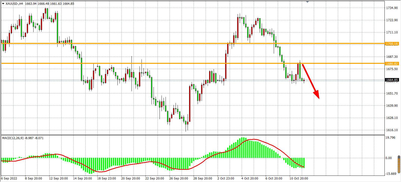 4小时图看,金价反弹不破1680后再度下行,MACD于零轴知悉持续放量,显示行情有进一步走低空间,目前阻力1680再次受到确认,日内在该位之下继续以看跌为主,下方目标1660-1640。