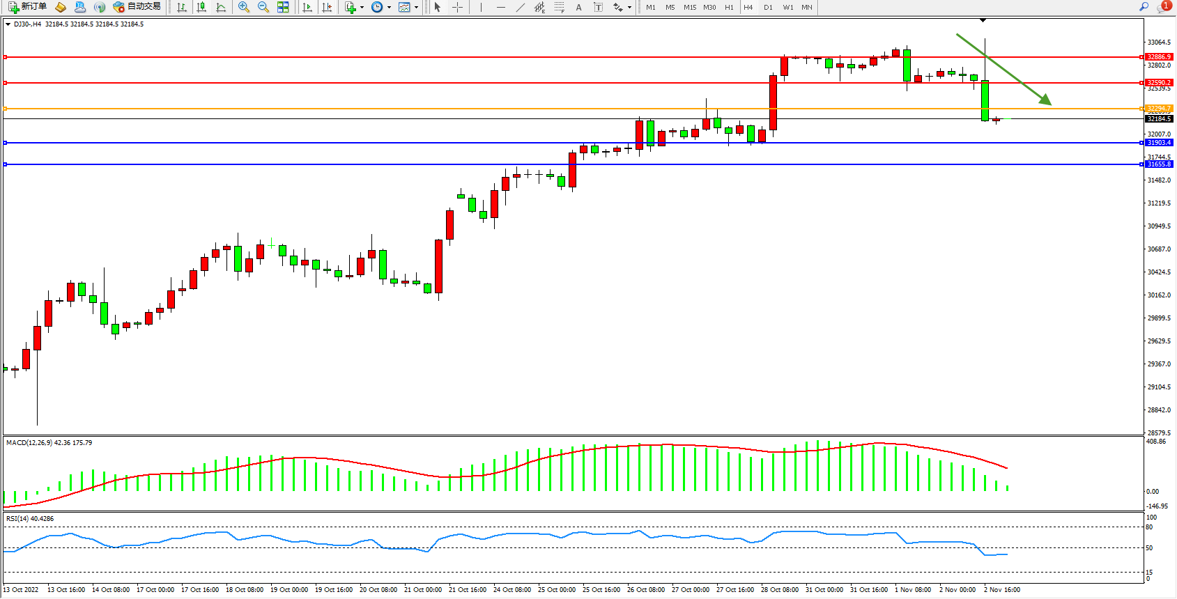 道琼斯指数11月2日(周三)收盘下跌506.43点,跌幅1.55%,报32146.77点;美联储公布最新的11月利率决议,美联储如期升息75基点,至3.75-4.00%,符合预期。