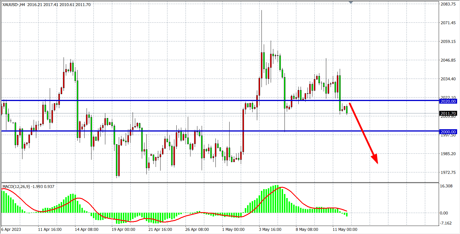 4小时图看,黄金冲高回落跌至2020关口之下,同时MACD量能柱下穿零轴,短线回调压力加大,当前2020支撑转为阻力,日内在该位之下看回调,下方看2000-1980附近。
