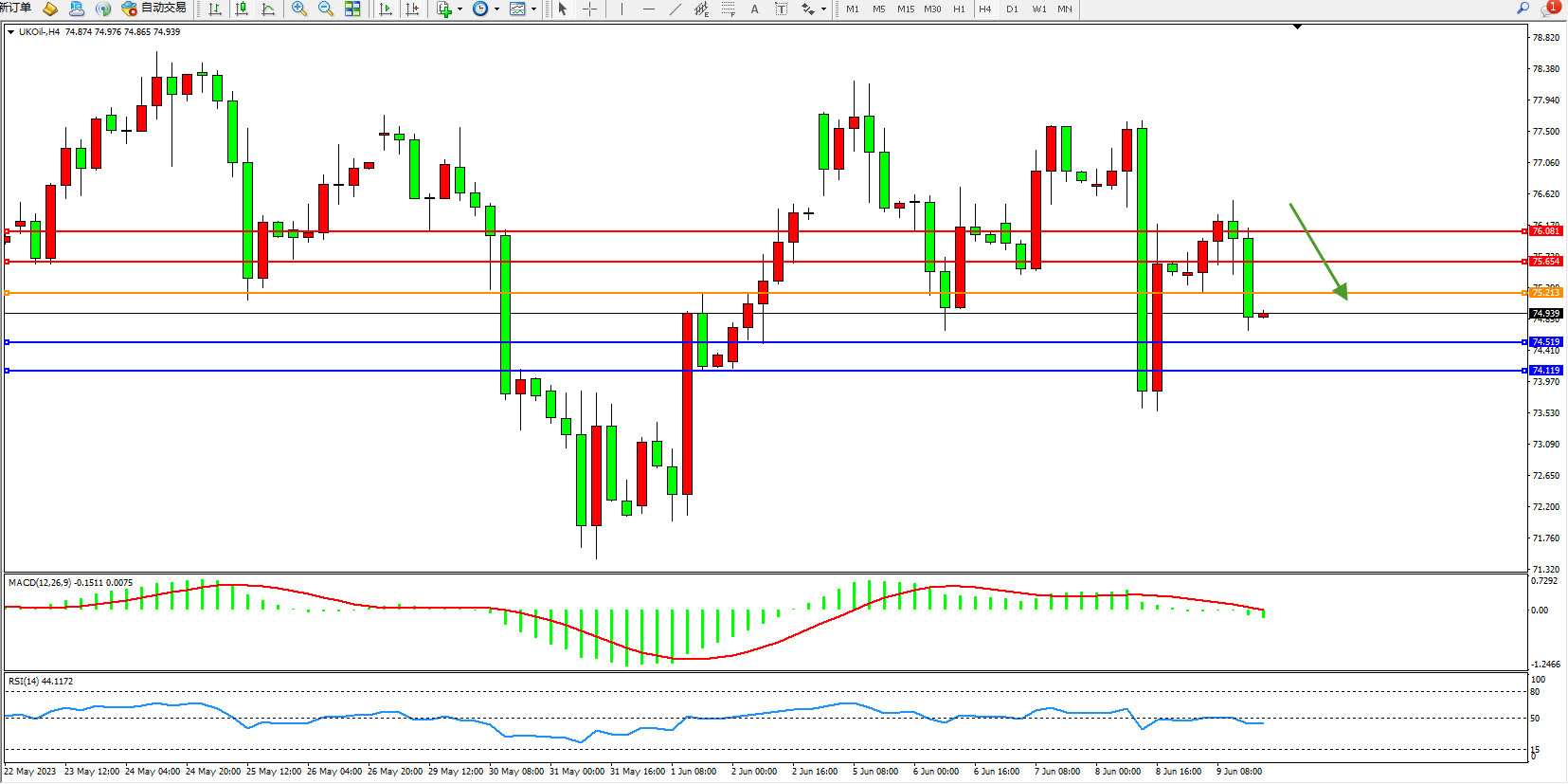 交易策略:75.213下方看跌,目标74.519 74.119