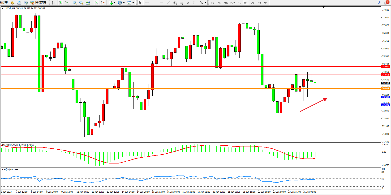 交易策略:74.004上方看涨,目标74.663  75.061