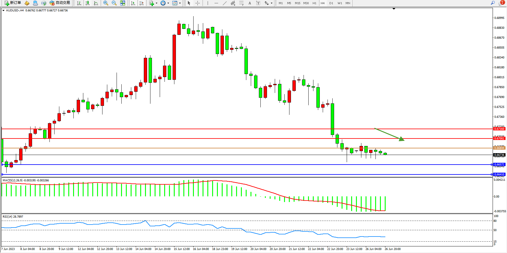 交易策略:0.66844下方看跌,目标0.66572 0.66410