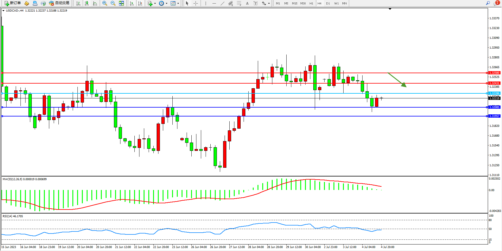 4小时图看:空头动力维持震荡下行,短期跌势或将延续,市场整体不断向下移动中,MACD指标维持震荡下移至0轴线附近徘徊,RSI指标处于50均衡线下侧弱势整理;