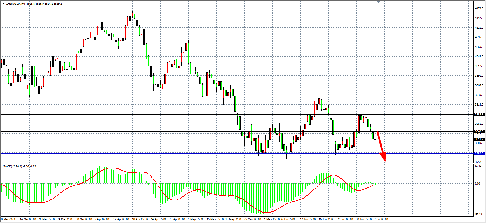 4小时图看,沪深300进一步回落至3840之下,MACD在零轴附近缩量,在3840之下继续看跌为主,下方支撑关注3780-3700附近。