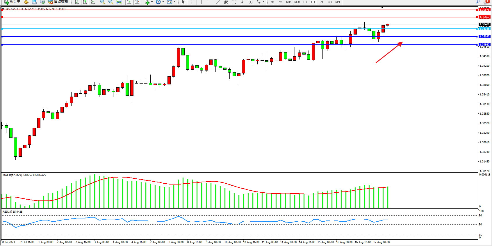 4小时图看:多头动力维持震荡向上移动,市场看涨情绪持续,MACD指标处于多头区域高位整理,RSI指标处于多头区域震荡;