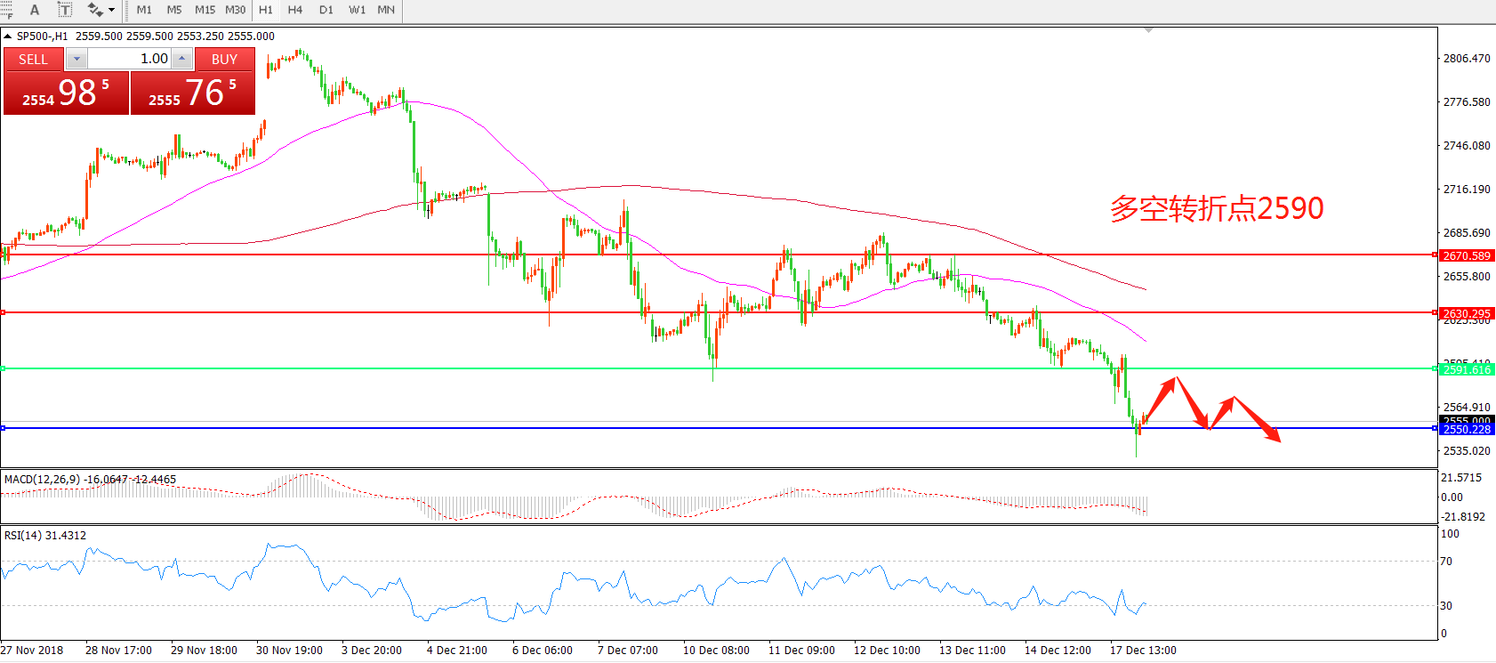 4小时图看,标普500连续下行,跌破2590支撑后再次考验2550附近支撑,均线系统呈现空头排列之下, MACD绿柱增加,RSI掉头向下,短期回落风险依然较大。