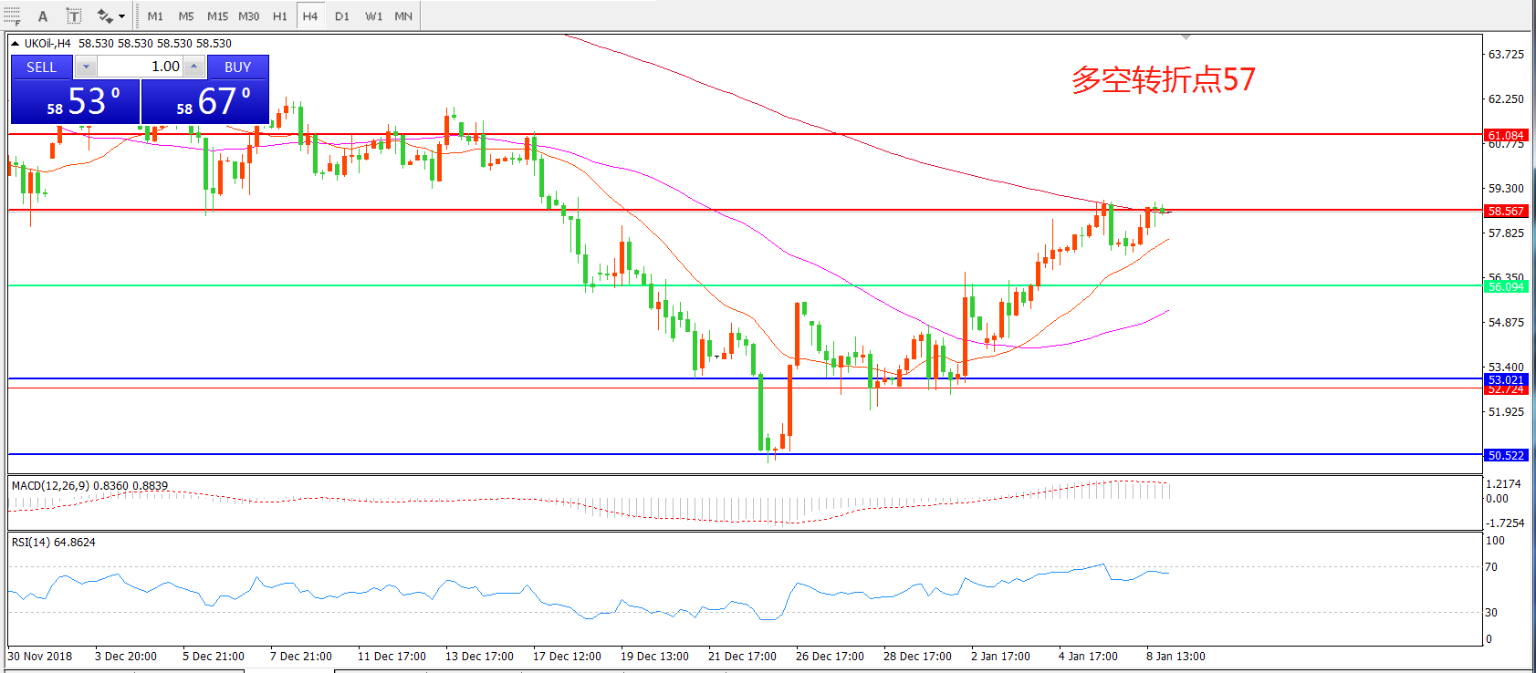4小时图看,油价站稳47美金后稳步上行, 21与55均线形成金叉,200均线被突破站稳,MACD红柱增加,RSI指标拐头,日内反弹概率较大。