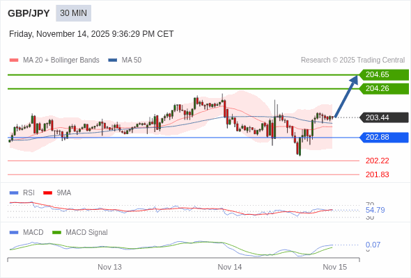 英镑/日元 当日内 : 看涨,当 202.88 为支撑位。