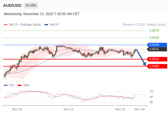 在 0.6540 之下,看跌,目标价位为 0.6510 ,然后为 0.6495 。