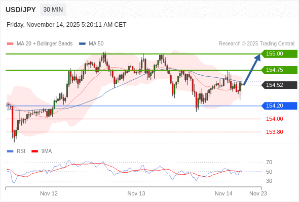 在 154.20 之上,看涨,目标价位为 154.75 ,然后为 155.00 。