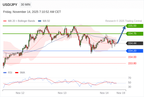 在 154.20 之上,看涨,目标价位为 154.75 ,然后为 155.00 。