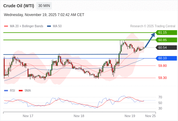 在 60.10 之上,看涨,目标价位为 60.85 ,然后为 61.15 。