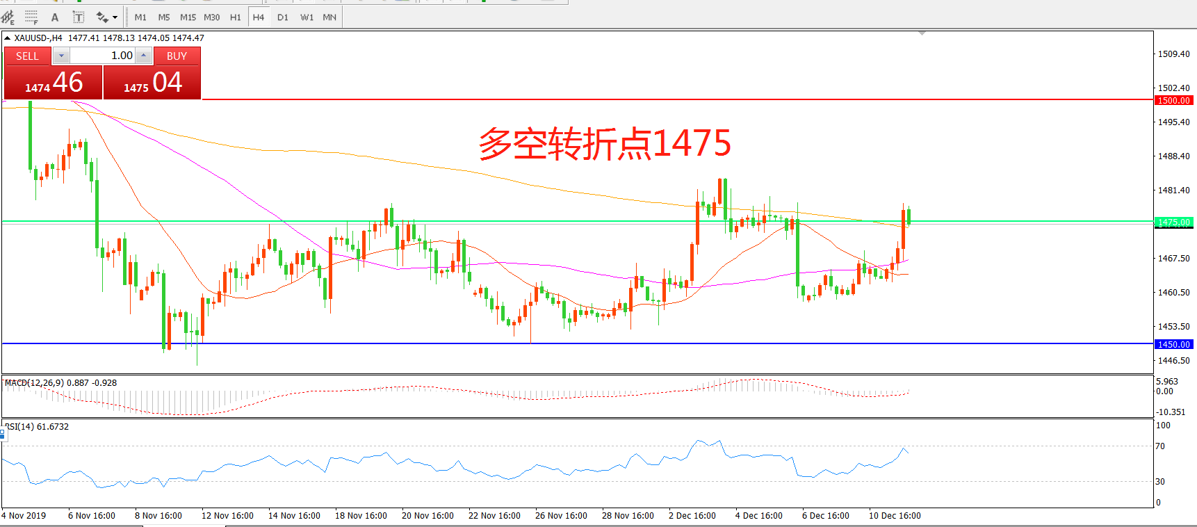 周四(12月11日),在结束为期两天的货币政策会议后,美联储宣布维持利率不变,符合市场预期。鲍威尔称现行政策合适,并暗示明年也不会调整利率,值得注意的是,美联储一致投票支持政策决定,没有委员投出反对票,为5月份会议以来首次。决议公布后,现货一度短线下滑,但由于利空已经提前消化,近期市场上的风险事件依然帮助黄金企稳反弹,重返1470美元,收报1474.53美元/盎司。英国大选投票在即,市场焦点目前转移到这个方面。