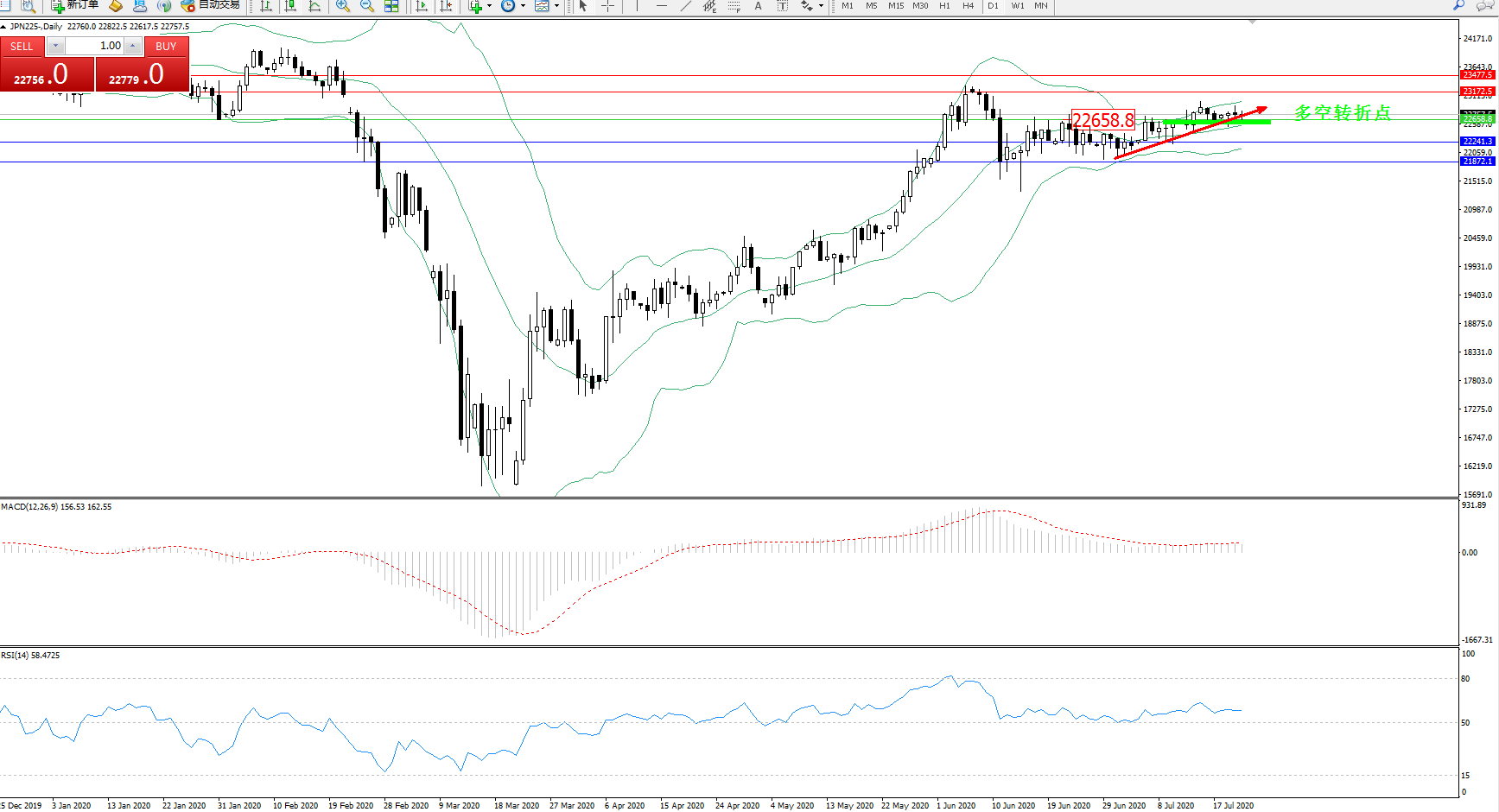 日经225指数7月22日(周三)收盘下跌119.22点,跌幅0.52%,报22765.00点。日本首相安倍晋三:将保持活动限制措施直到8月底。重症病人减少使得当前状况不同于4月。当前入境规则将延长至8月底。将逐步允许得到许可的外国人重新入境。将考虑允许参加奥运会的运动员和工作人员入境。据日本放送协会NHK:日本神奈川县新增超65例新冠肺炎确诊病例。日本东京都会区观察机构监测显示病毒感染正在蔓延。日本政府小幅上调7月总体经济评估,为连续第2个月上调。近期经济有提速的迹象,但因为疫情的反复出现,总体状况仍然严峻。因全球汽车需求已经见底,提高对7月出口和产出的评估。日本政府在14类经济产业中上调了对6类产业的评估。上调了对消费出口和产出的评估。