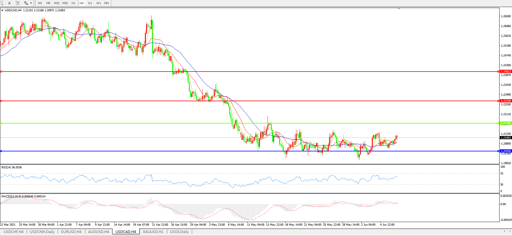 技术面简析:4小时图均线粘合无明显方向,汇价弱势整理,MACD运行于0轴附近但量能有放量迹象,RSI短期偏强,预计短期汇价大概率将在反弹修正后再度下行。