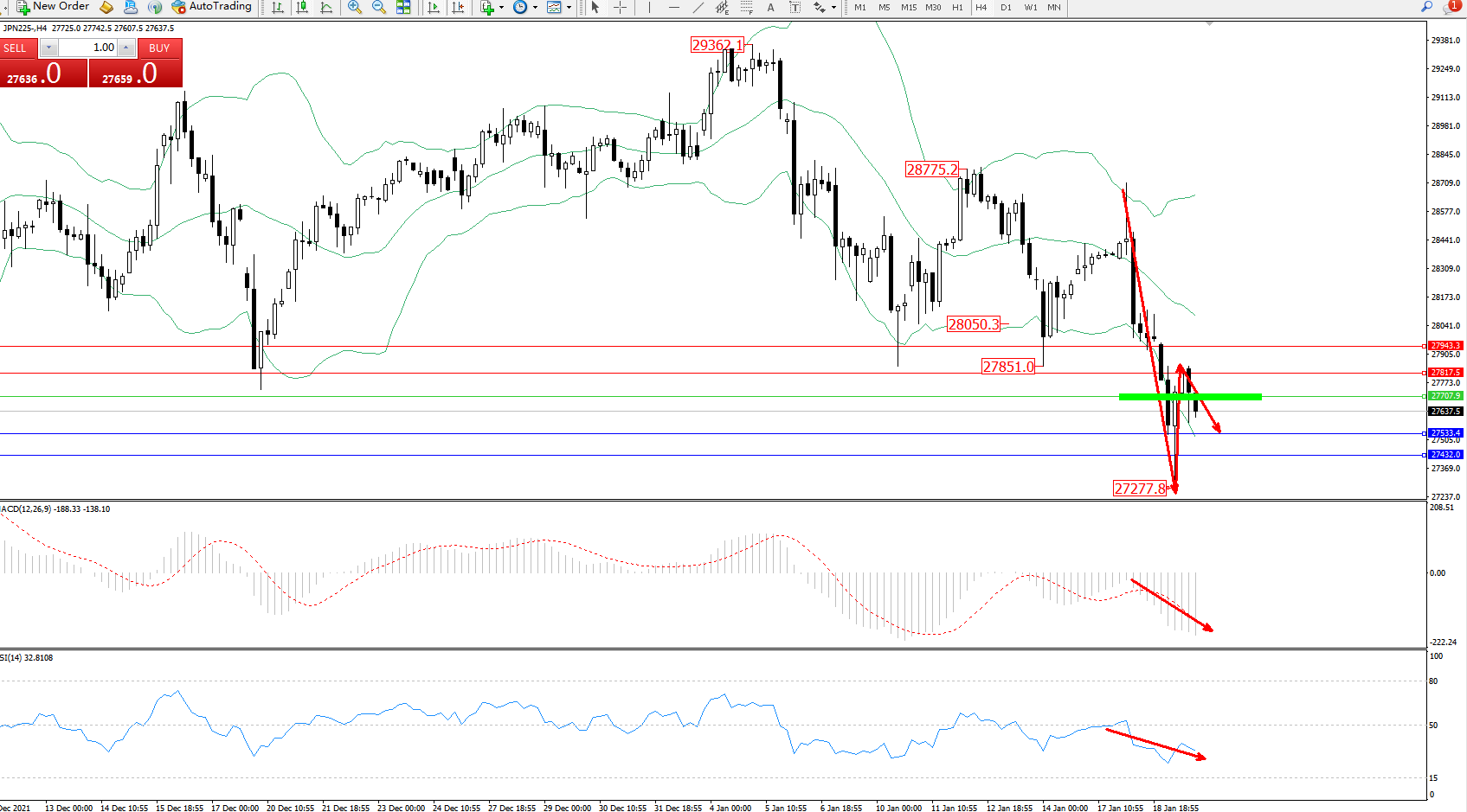 日经225指数1月19日(周三)收盘下跌819.25点,跌幅2.90%,报27438.00点。日本央行称:从短期来看,原材料成本对消费者通胀的影响似乎很小。必须注意通胀过度的风险,因为企业可能会以比预期更快的速度将上涨的成本转嫁给家庭。不断上涨的原材料成本对消费者的传递并未蔓延到广泛的商品领域。