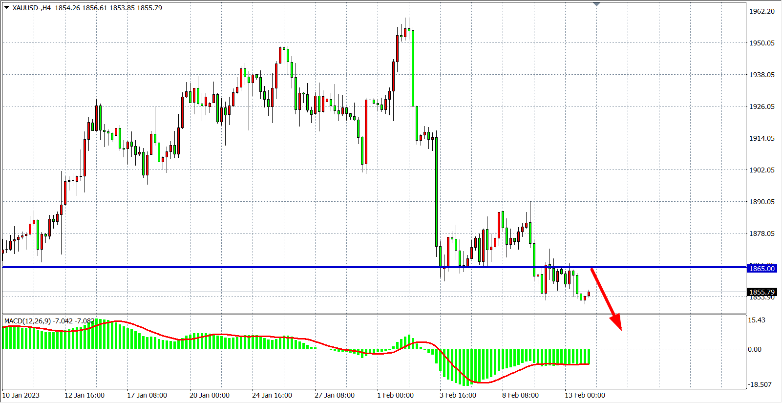 4小时图看,金价于1865受阻再度走低,MACD也在零轴之下均匀放量,显示行情短线延续弱势,空头趋势延续,阻力下移1865,在该位之下继续看跌为主,下方目标1830-1830附近。