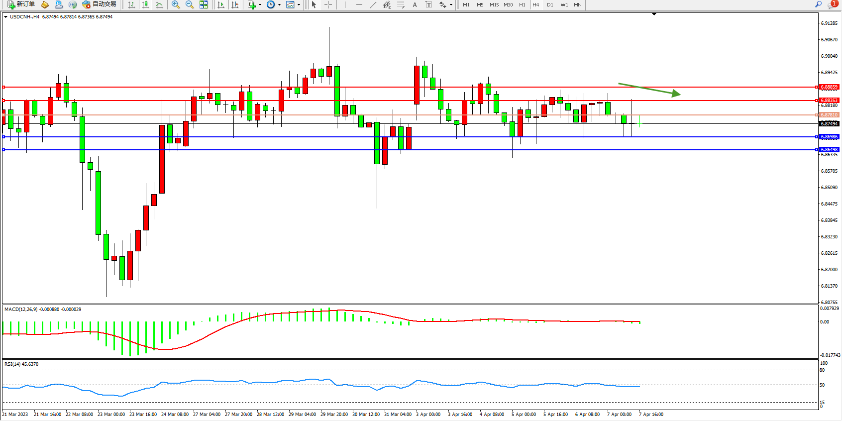 交易策略:6.87810下方看跌,目标6.86986  6.86498