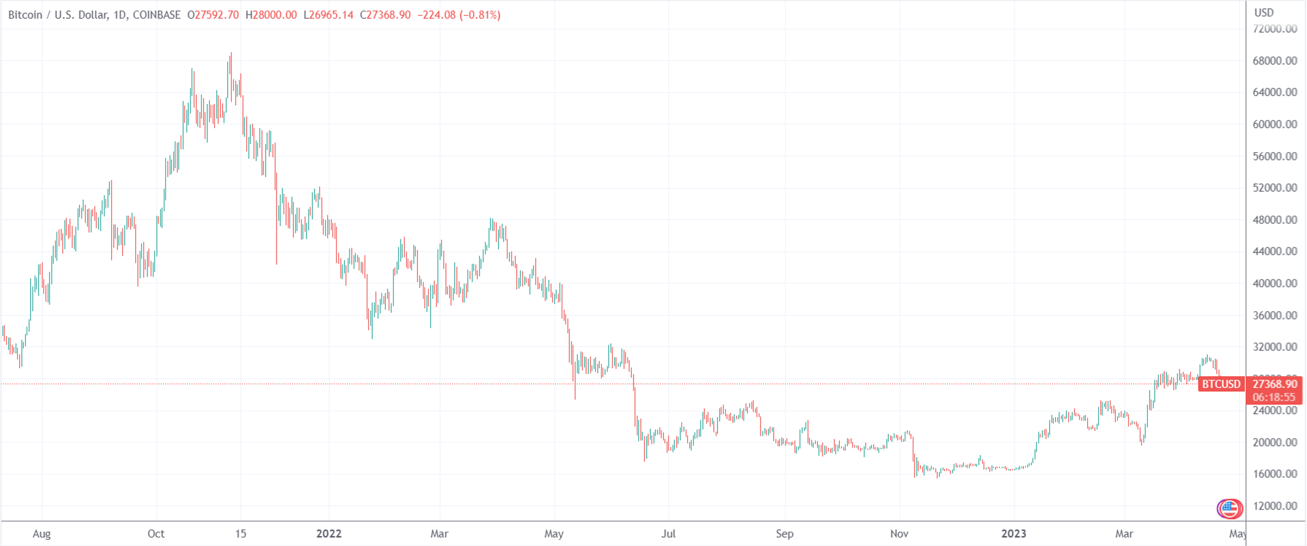 作为前情回顾,比特币在2021年末一度摸到6.9万美元一个,随后便开始持续下跌。经历去年春季开始的一系列事件后,最低跌至1.5万美元。在近期硅谷银行事件后,比特币一度涨回3万美元关口,现在的价格大致在2.7万美元左右。