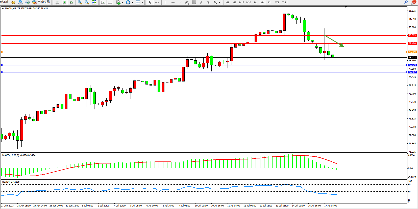 4小时图看:高位空头力度维持震荡下移,短期跌势或将延续,市场空头情绪笼罩,MACD指标处于0轴线附近徘徊,RSI指标处于50均衡线下侧弱势整理;