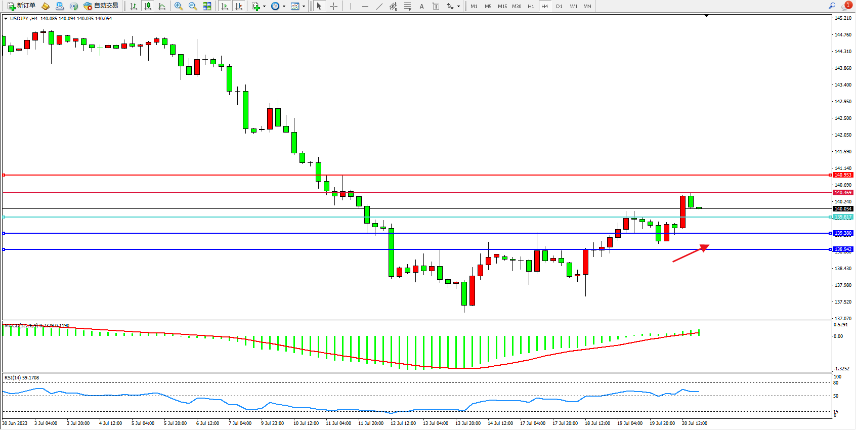4小时图看:多头动力维持震荡向上移动,短期看涨情绪持续,市场整体多头不断上移中,MACD指标处于0轴线上側弱势徘徊,RSI指标处于50均衡线上側弱势整理;