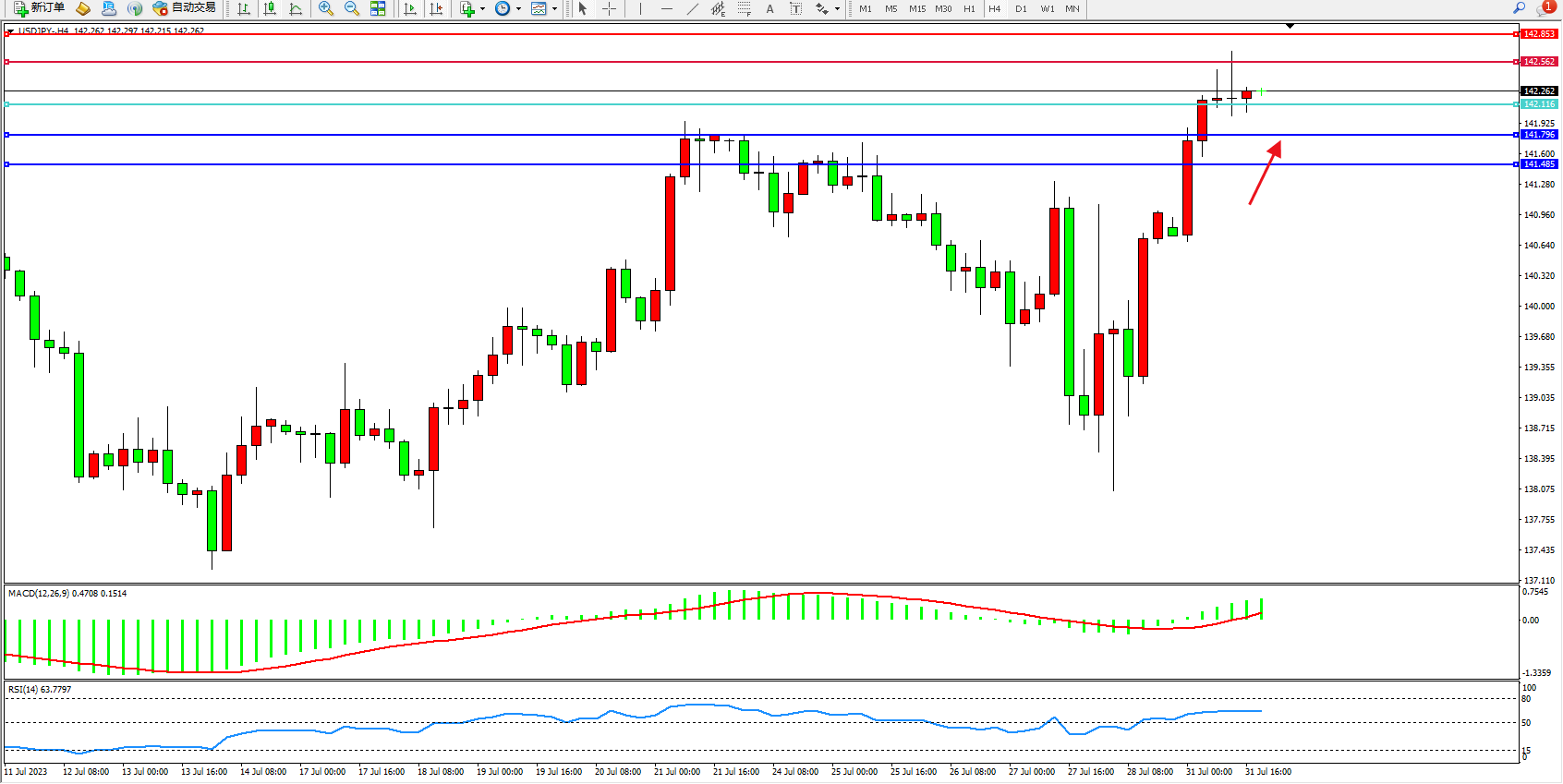 交易策略:142.116上方看涨,目标142.562 142.853